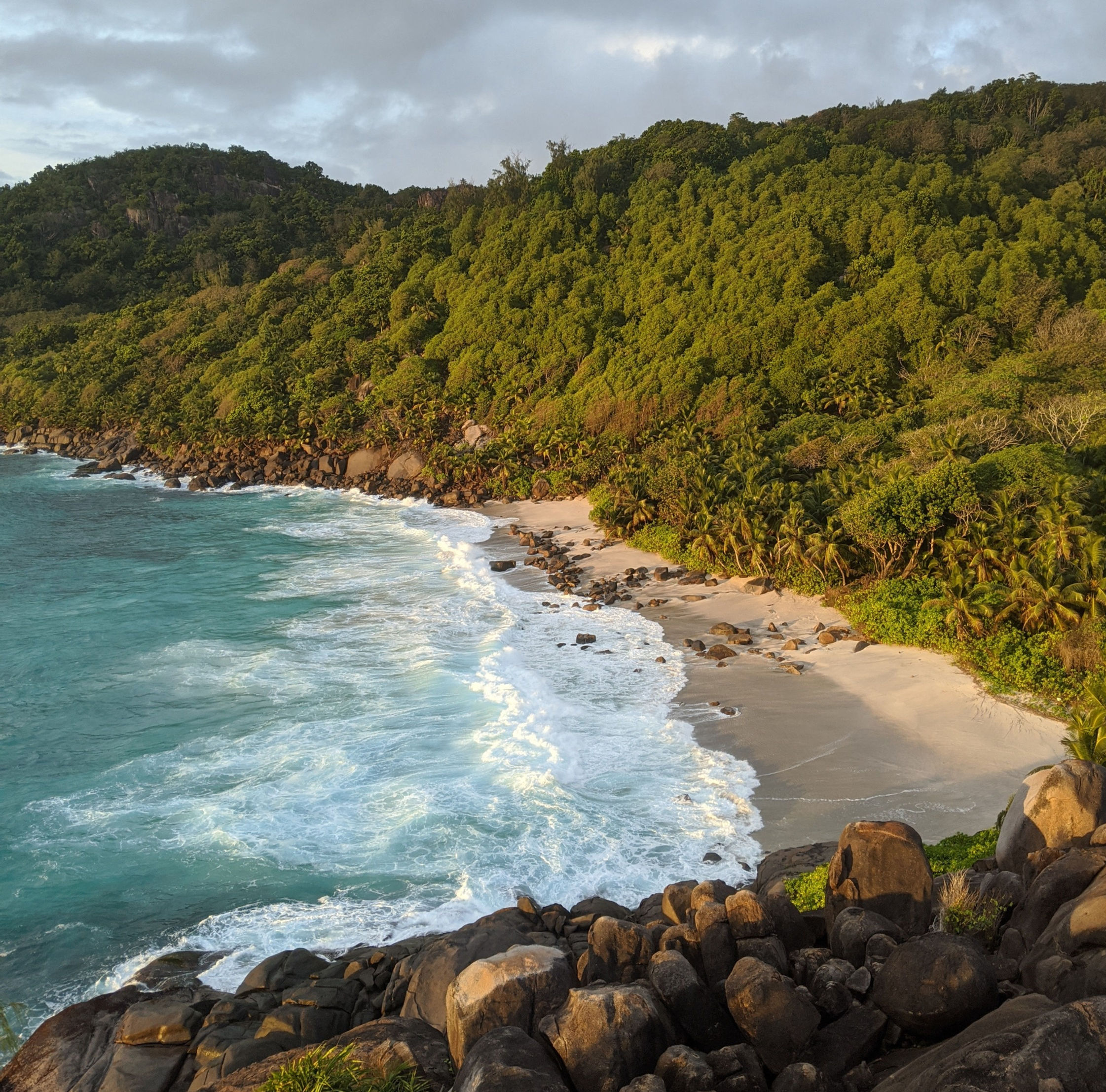 WALK THROUGH THE JUNGLE, SUNSET, VIEW OF WEST COAST OF MAHE, ISLAND VIEW, OLD BRITISH RADIO STATION.